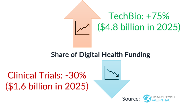 This dynamic has created a severe imbalance in capital allocation. Between 2020 and 2025, the share of digital health funding allocated to TechBio surged by 75% to reach 4.8 billion USD, while funding for clinical trial innovation contracted by 30%, with only 1.6 billion USD deployed in 2025. This divergence reveals a fundamental misunderstanding of pharmaceutical economics. Today, clinical trials consume more than 50% of total R&D costs.