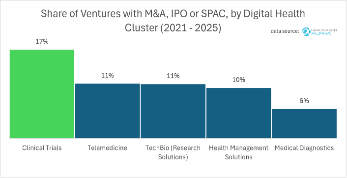 To understand the mispricing of this asset class, one must look at exit liquidity. Clinical trials ventures represent only 3% of the total digital health startup ecosystem, making them appear to be a niche category on the surface. Yet, it is disproportionately strategic. An astonishing 17% of ventures in the clinical trials cluster have successfully exited via M&A, IPO, or SPAC—a rate that dwarfs those in other highly publicised clusters such as Medical Diagnostics, TechBio, and Health Management Systems.