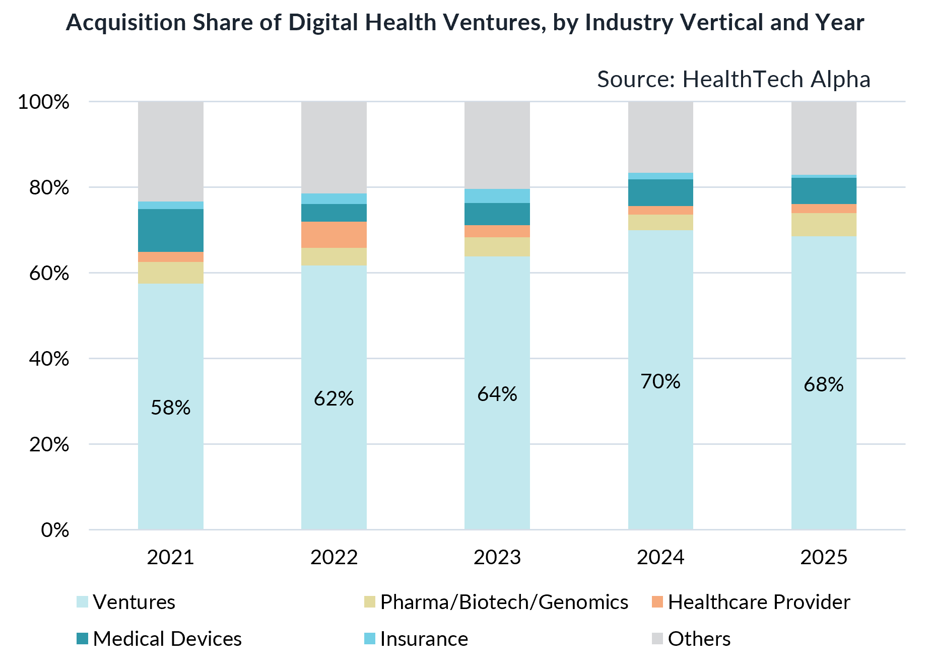 A critical shift in the exit landscape over the last five years has been the identity of the acquirers. While strategic buyers and private equity remain active, venture-to-venture acquisitions have become the primary engine of consolidation. This trend has strengthened significantly over the past five years. In 2021, ventures accounted for 58% of acquisitions; by 2025, that figure rose to 68%.