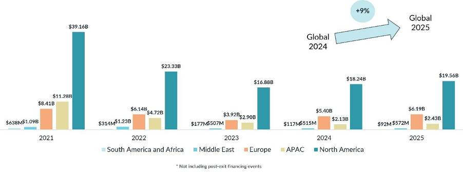 The US remained the largest market by total capital deployed, underlining its continued leadership in late-stage financing and mega-rounds. Yet the more dynamic shift occurred in Europe. With funding up 15% year-over-year, Europe emerged as the fastest-growing region globally, reinforcing a trend Galen Growth has highlighted repeatedly: regional ecosystems mature fastest when capital, talent, and policy align.