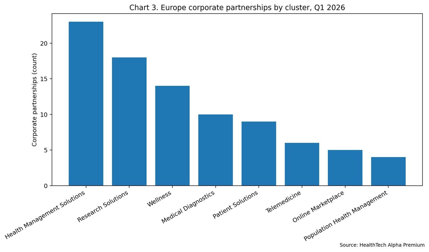 When we examine the nature of these corporate partnerships by cluster, the focus on direct clinical utility is evident. Health Management Solutions, Patient Solutions, and Wellness represent the most active clusters for partnership formation.