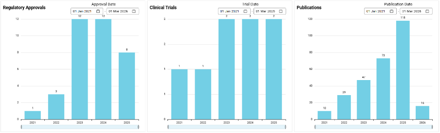 Most importantly, these 50 ventures have proven their ability to attract serious capital and forge critical alliances. In total, they have secured $737 M in funding. They boast an impressive Average Alpha Score of 54.2, indicating that they are more mature than their peers, and they have collectively announced 139 strategic partnerships. Their commitment to clinical reality is cemented by a staggering 296 peer-reviewed publications, 40 regulatory approvals, and 21 clinical trials to date.