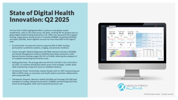 The first half of 2025 has been a defining moment for Asia-Pacific’s digital health ecosystem, as the region pivots from hype to evidence-backed, AI-driven innovation. While global digital health funding declined by 11%, APAC defied the trend with $1.2B raised across 102 deals, reflecting 4% YoY growth. This performance cements APAC’s role as a resilient and fast-maturing hub for health technology, with standout contributions from Australia ($286M), Hong Kong ($233M), and Japan ($202M).