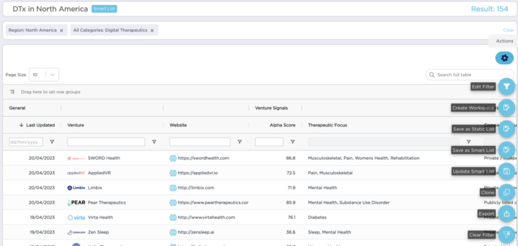 Smart Lists are a powerful tool that allow users to create dynamic lists of Digital Health ventures, investors, or corporations based on our advanced filters. These filters can be customized to specific criteria such as funding rounds, location, industry focus, and more.