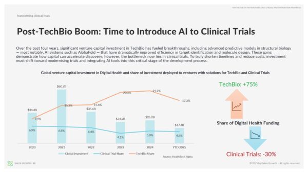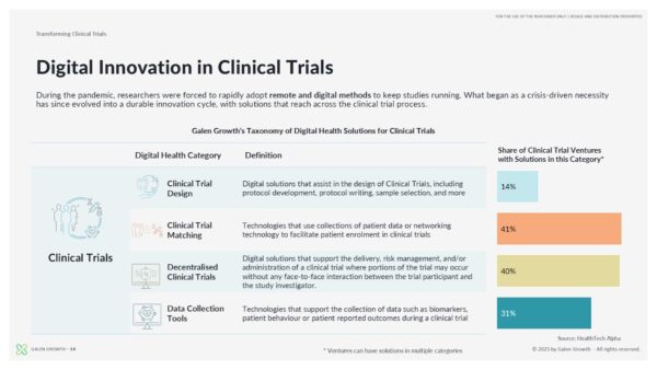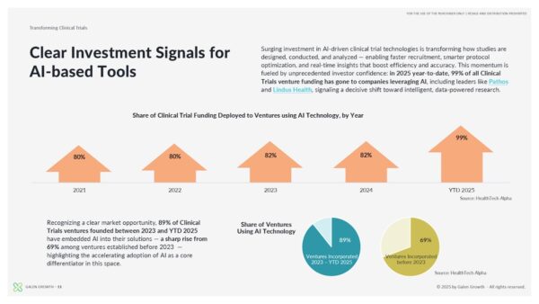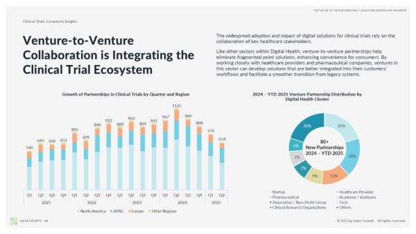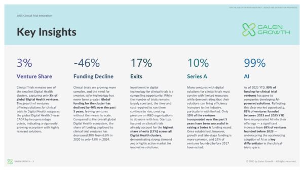 Galen Growth’s latest thematic report—Clearing the Bottleneck: How Digital Innovation is Driving Clinical Trials—unpacks the data behind this shift. Leveraging HealthTech Alpha’s proprietary venture intelligence, the report identifies how startups, investors, and pharmaceutical leaders can convert the industry’s most persistent bottleneck into its most powerful accelerator.