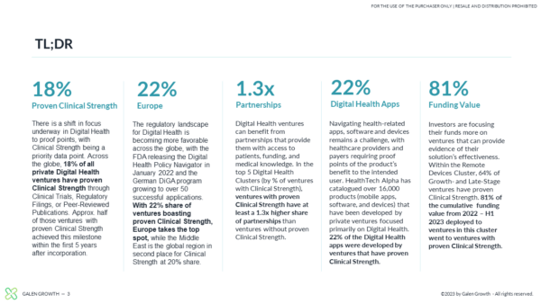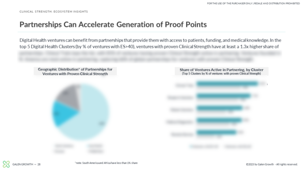 Galen Growth is pleased to share with you our latest insights on the Clinical Strength of Digital Health ventures. We define the boundaries of this important topic and connect the importance of proof points for funding, product development, and partnerships. Our analysis focuses on private ventures and includes ecosystem growth, most active partners, regulatory approvals and venture funding.