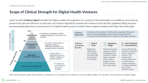 While a great idea and good business acumen have scaled strong Digital Health companies over the past decade, there is a shift in focus to proof points, with Clinical Strength being a priority data point. Galen Growth first published its industry-leading research report in 2022 looking at the Clinical Strength of a Digital Health venture by evaluating a venture’s clinical trials, regulatory filings, and peer-reviewed publications.