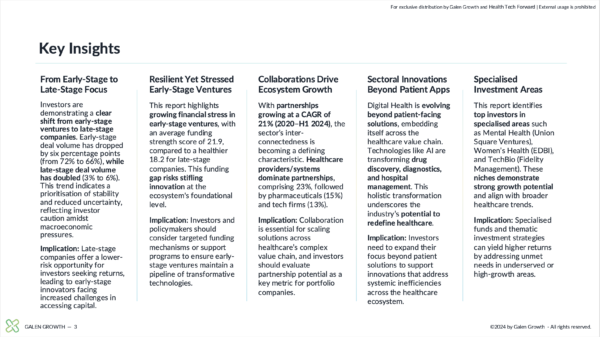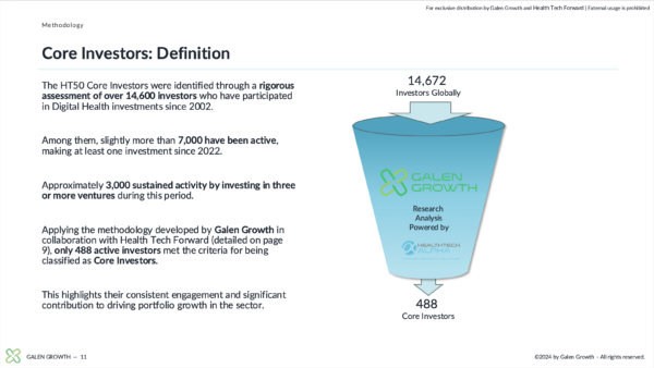 The HealthTech 50 Core Investors 2024 report by Galen Growth provides a deep dive into the top investors revolutionizing the digital health landscape across global markets. This third-edition report, launched at Health Tech Forward 2024, evaluates the investment activities, partnerships, and innovation metrics that define the ecosystem. By harnessing the robust data analytics of HealthTech Alpha, the report presents an unbiased, data-driven ranking of 50 leading investors who are instrumental in shaping the future of digital health. The report highlights critical trends, including the growing shift toward late-stage investments and the rise of targeted funding in specialized health areas like Mental Health, Women’s Health, and TechBio, which align with global healthcare priorities.