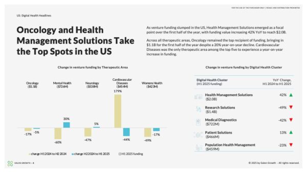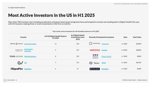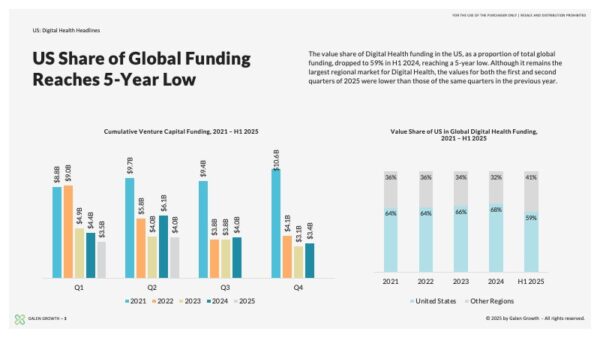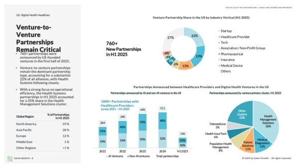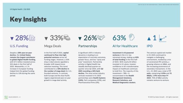 Galen Growth is pleased to share with you our 2025 Q2 Analysis on Digital Health Innovation in the United States. We look across the startup ecosystem for Digital Health and explain the current trends that are driving demand. Our analysis focuses on private ventures and includes ecosystem growth, most active partners, regulatory approvals and venture funding.