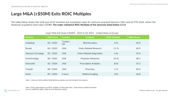 A key indicator of the sector’s potential lies in the high returns achieved by exit-stage ventures. In recent years, over 1,480 Digital Health companies have exited, and major M&A deals in 2023–2024 have posted a median return on invested capital (ROIC) of 7.2. This data reflects a strong trend of profitability, validating the sector’s appeal to investors.