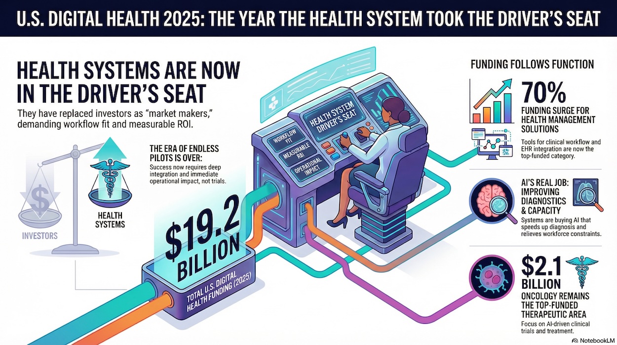 Bottom line: U.S. digital health has entered a provider-led scaling era. Investors must underwrite deployability. Startups must build for integration and immediate operational impact. Health systems now sit firmly in the driver’s seat.