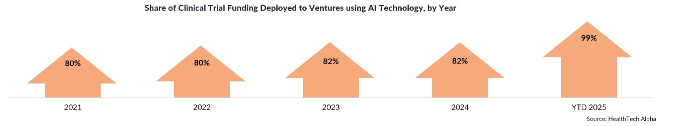 Yet, the data also reveal extraordinary momentum beneath the surface: AI-driven clinical trial ventures now account for 99% of all funding in 2025. Moreover, 89% of new ventures founded since 2023 have embedded AI into their solutions — up from 69% in earlier years.
