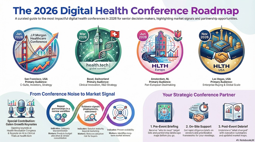 In 2026, we are prioritising conferences where we can spend meaningful time with senior decision-makers—and convert “conference noise” into evidence-led signals for clients using HealthTech Alpha.